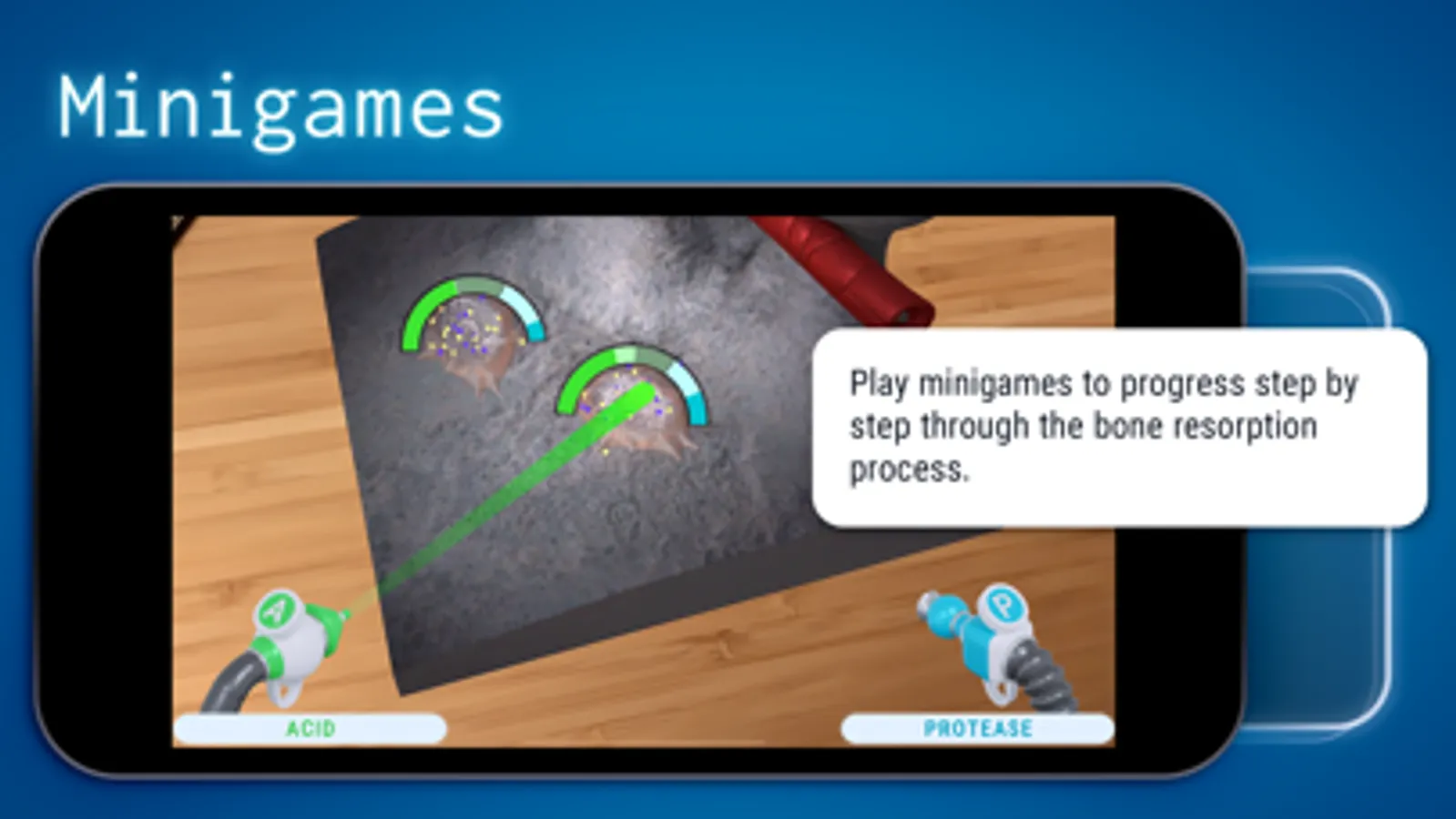 This app accompanies the book “Cell-to-Cell Communication: Cell Atlas – Visual Biology in Oral Medicine” and allows the user to experience the process of bone resorption in augmented reality. AR Osteoclasts draws you into the microcosm of osteoclasts right above the bone surface. In the augmented display, you are zoomed in to the level at which an osteoclast precursor cell appears to be the size of a hand. You investigate the bone resorption process from all sides by moving around the augmented display on top of your book page and you interact with cells to learn more about their function.