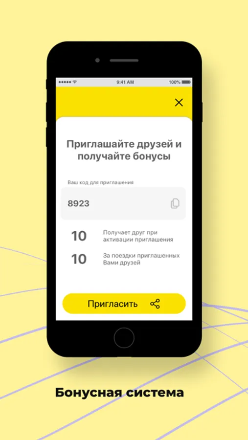 При помощи реферальных кодов приглашай друзей и получай за каждого бонусы, а потом трать их на оплату поездок. Количество бонусов можно распределить перед созданием заказа. А еще можно сохранять промокоды и использовать их для выгодных поездок.