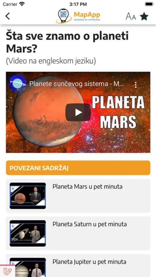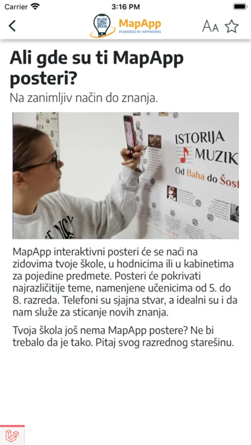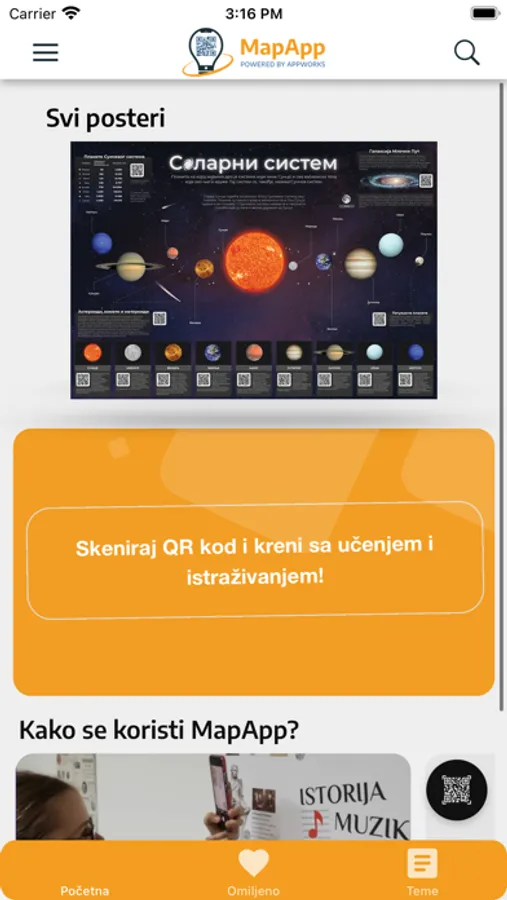 MapApp interaktivni posteri možda se već nalaze u tvojoj školi, u čekaonici ili na radnom mestu. Na njima ćeš primetiti QR kodove, koji otvaraju digitalni sadržaj u okviru aplikacije. Skeniraj taj QR kod i otvoriće ti se spisak dodatnog digitalnog sadržaja na tu temu. Na primer, skeniranjem QR koda koji se nalazi pored planete Mars na posteru Sunčevog sistema aplikacija ti nudi sadržaj u vezi sa Marsom.