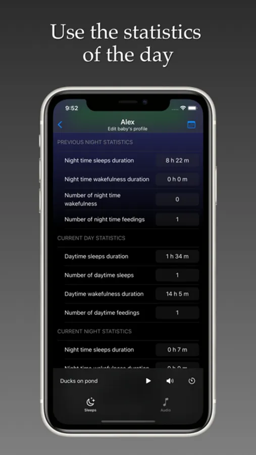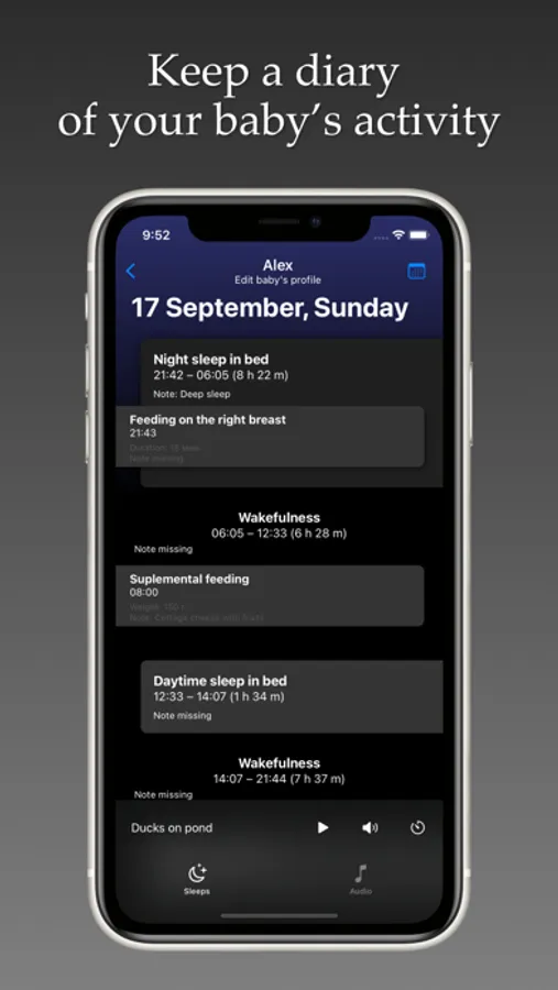 - Keep an activity diary (sleeping, waking, feeding, etc.) for several children. The application will automatically calculate statistical data for each day.