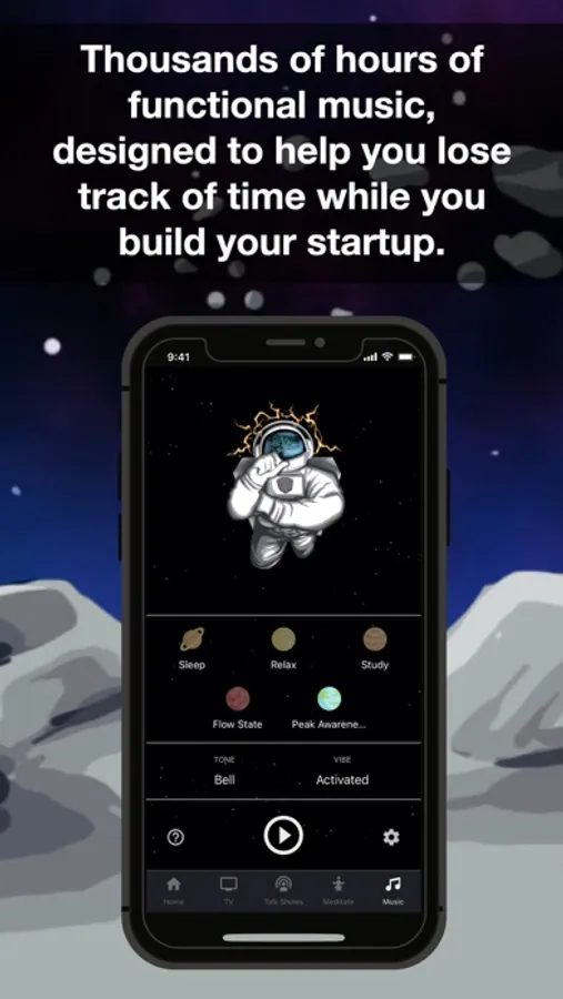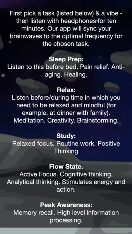 We also have functional music, AKA bi-naural beats, which is ambient music with a scientific twist. Use the app to pick a task, such as study, sleep, flow state, etc. Our music will then auto-tune subliminal frequencies into the background of the music that will sync your brainwaves to the optimal frequency for the task. Use it to help you turn on your focus for the day, or relax at night when it's time to wind down.