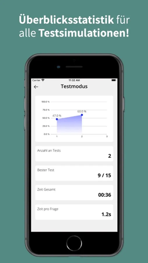 Die Statistik bietet dir einen genauen Überblick über die Anzahl der Fragen, Anzahl der korrekt beantworteten Fragen, die Zeit pro Frage und der Anzahl der verwendeten Hilfeanfragen. Dabei gibt es sowohl eine Überblickstatistik, als auch eigene Statistiken für jeden Schwierigkeitsgrad und den Testmodus.