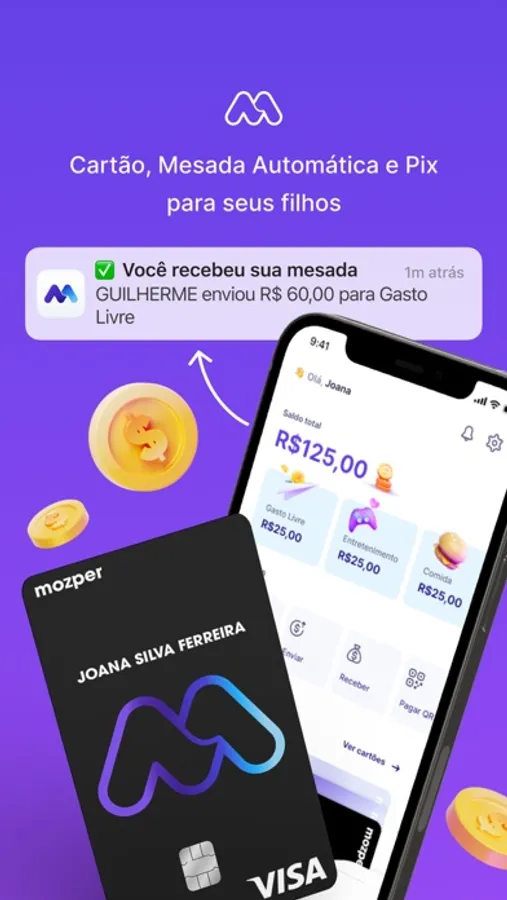 Oferecemos um cartão Visa pensado para crianças e jovens que os pais administram pelo aplicativo, onde podem depositar a mesada, criar regras de gastos, atribuir tarefas e definir metas de poupança! Desta forma, os jovens recebem uma educação financeira prática e real desenhada para a era digital. Mozper oferece um cartão virtual para uso em compras online e um cartão físico para compras em lojas físicas.