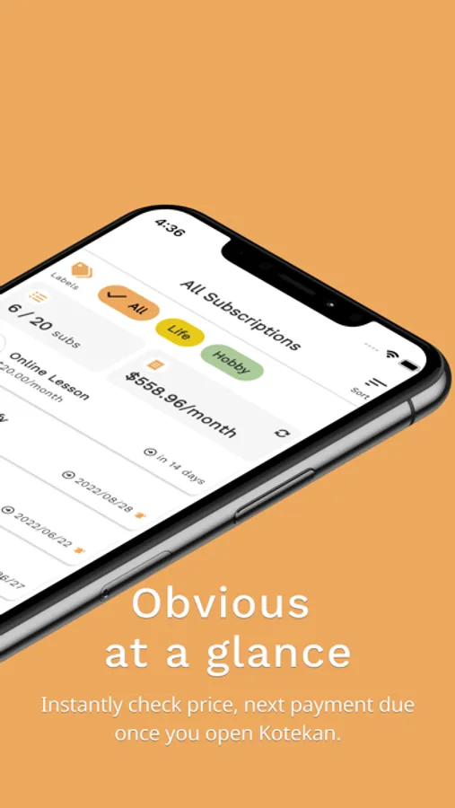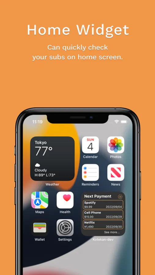 You can place Kotekan widget on your home screen, which allows you to quickly check your next payment due of your subs.