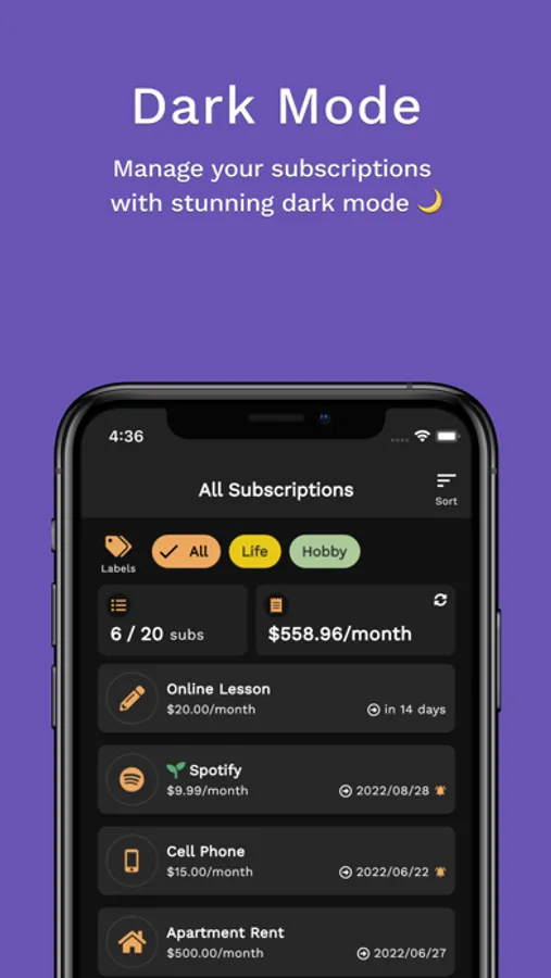 Open app, input the name of service, fee, frequency of paying, and first bill date to register your sub.