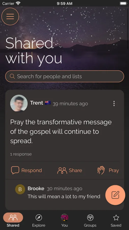 Tuia is your daily prayer app. Tuia gathers people in prayer and reminds us that though we may be scattered (distant physically), we are one in prayer. For this purpose, the main features of Tuia are brought together in Daily Devotions, which weaves together Daily Devotions with Bible readings, your personal prayer list, shared prayers and more.