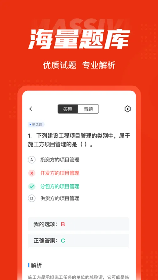 二级建造师题库内含考点练习,全国通用卷以及地区卷模拟练习,以及按照固定考试比重的随机式的抽题的真题考场,成绩单实时记录考试数据,一点一滴的反馈考生近期学习状态以及自我正确率的提升,大大的给予考生通过考试的信心。