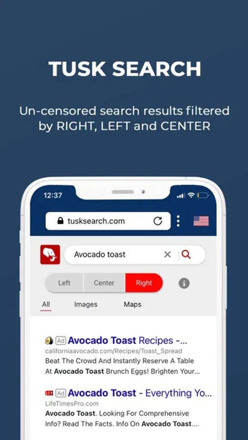 With TUSK’s built-in Search Engine and News Feed, you can easily access all the articles from popular media organizations that you trust, such as, Fox News, New York Post, Newsmax, OANN, The Daily Wire, Breitbart, and many others. No more buried stories or media censorship! TUSK Search features easy-to-use RIGHT, LEFT and CENTER buttons so you can filter the organic search results easily. Missing your favorite news source? Easily customize the relevant news publishers you want to see in the TUSK News Feed and on your homepage, this way you have 100% control. No other news feed has built-in predictive AI to show you the articles that everyone is engaged with right now, as well as the breaking stories that will matter most in the hours and minutes ahead. TUSK remains committed to giving you the clarity and insight that no other search and news source can.