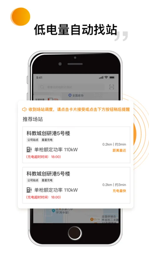 【充电调度】低电量自动触发充电调度,为您智能筛选场站。接收管理端分配电站。充电更安心
