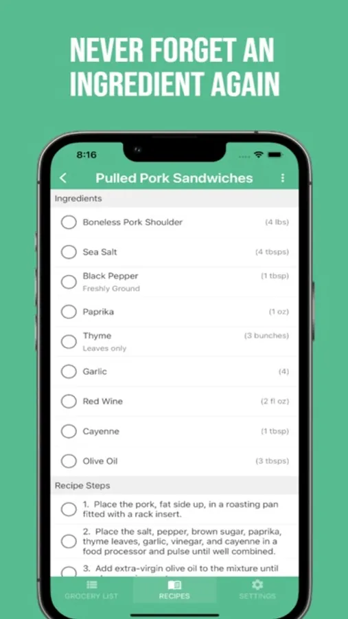 Instead of adding each ingredient one by one to your grocery list, Loaf can add all of the ingredients to your grocery list with a single tap of a button. Need to double the recipe? Just increase the number of batches and Loaf will automatically add twice the amount of ingredients. Already have some of the ingredients? Loaf allows you to select which ingredients you need before they are added to your grocery list.