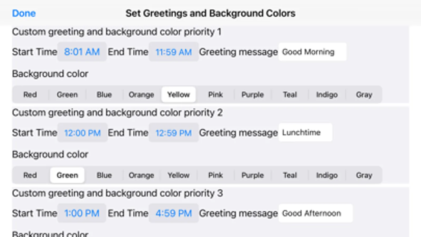 Mini Chroma Clock is a small clock that you can set 4 priority messages and background colors. You can set priority one to start at 8am and end at 12pm with the message of “Good Morning” with a background color of orange for the morning sun. Priority two could be from 12pm to 1pm with the message of “Lunch Time” with the background color of green. If you have over lapping times then the message and background with activate in the order of the priorities with one being the first priority and four being the last priority. If no priorities are active then a default background color without a message would be presented. Use hotkey “command + ,” or click on the menu to open the preferences page to edit the priorities.