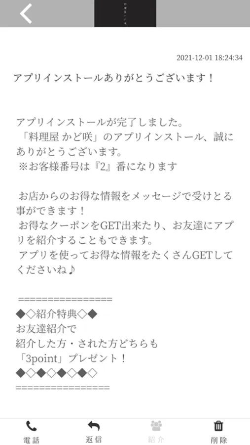 料理屋かど咲のアプリをSNSを通じてお友達に紹介する事ができます。