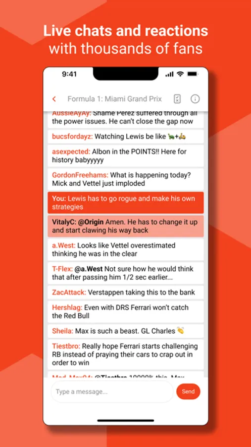 2. Live chats during races to react in the moment with thousands of other fans