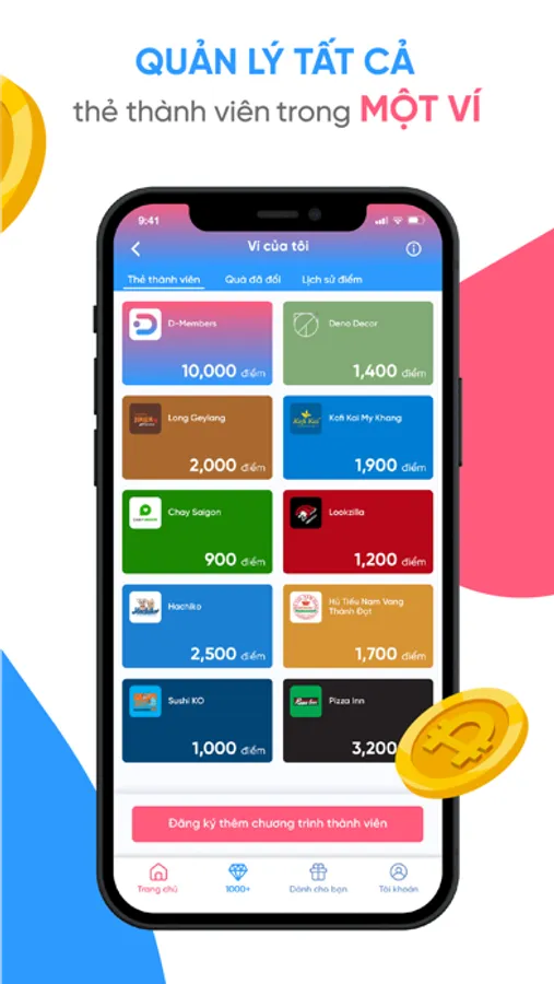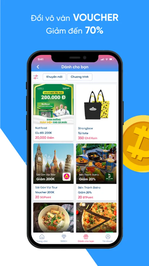 ● Dùng điểm tích lũy đổi hàng ngàn quà tặng giá trị, voucher giảm giá lên tới 70% đến từ các thương hiệu.