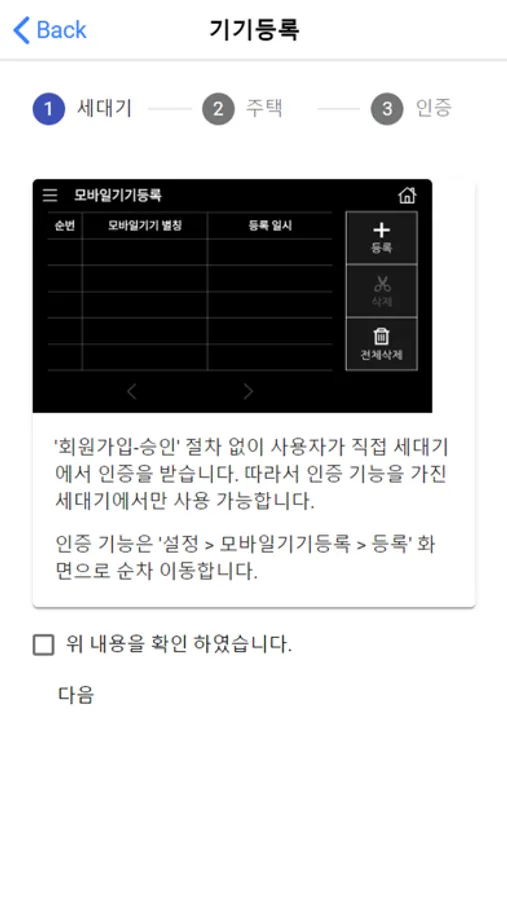 따라서, '인증 기능'을 가진 세대기에서만 사용 가능하며, 1대의 스마트폰에 1대의 세대기만 등록하여 사용 할 수 있습니다.