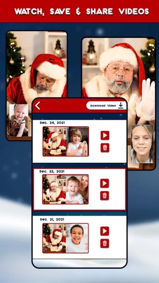 The spirit of Christmas comes right into your home. Download now and surprise your loved ones with a special video chat with Santa Claus. Access amazing free Christmas videos calls direct from Santa. Talking Santa Claus is a free app for enjoyment with your family and friends with fun video calls. Make your Christmas magical with a personalized message from Santa! Different personalized messages to encourage and celebrate: accomplishments, good behavior, overcoming challenges.