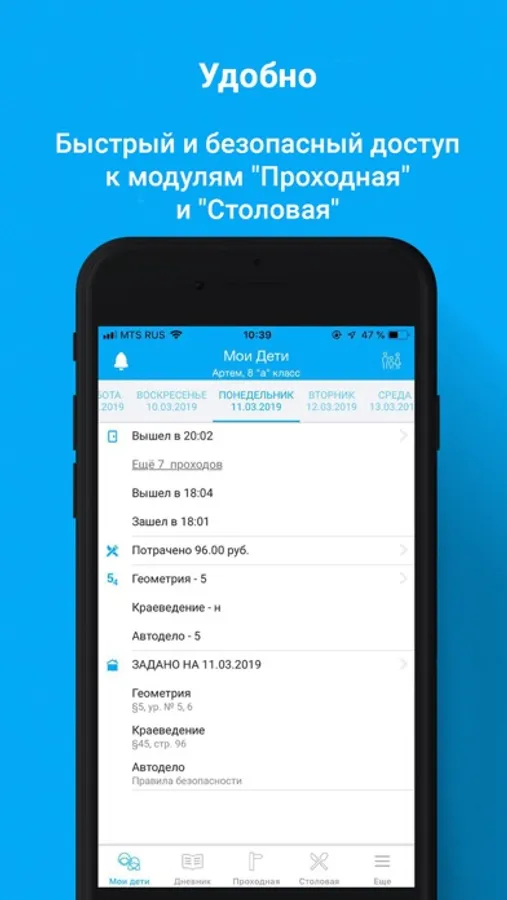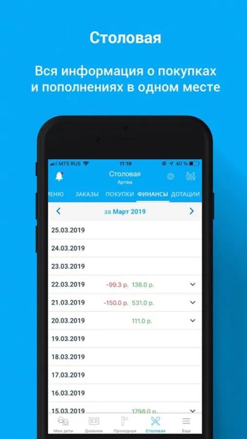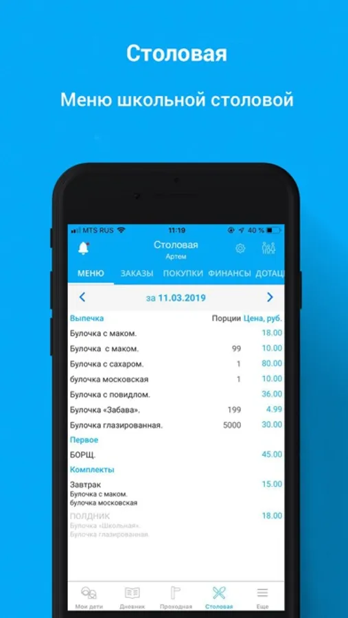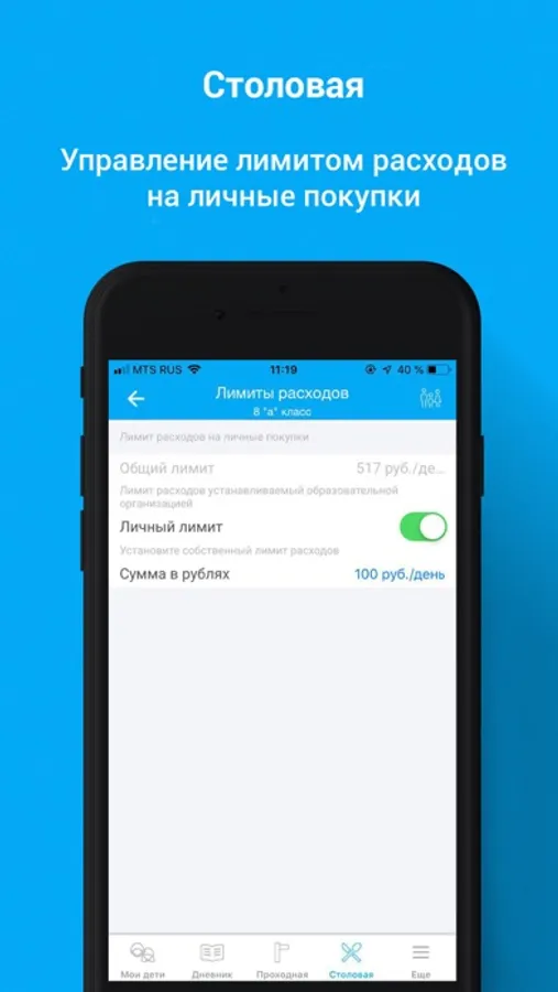 «Столовая» — пользователи получают информацию о школьной столовой: учёт льготного питания (бесплатное питание 1-4 классов) и его состав; меню, что приобретал ребенок в школьном буфете; контролировать остаток средств на карте ребенка; просматривать информацию о начислениях дотаций. Родители смогут переводить деньги между счетами своих детей. Дети могут создавать покупки с помощью мобильного приложения, аналогично терминалам самообслуживания и получать продукцию на точке выдачи в школьной столовой.