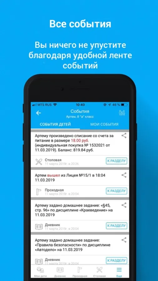 «Проходная» — родителей, в режиме реального времени, получают информацию о использовании ребенком Системы контроля и управления доступом в образовательном учреждении, каждый вход/выход ребенка записывается в архив событий, а на мобильное устройство родителя поступают push-уведомления.
