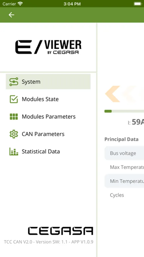 • Parameters of each module: Voltage, current, state of charge, temperature, etc.