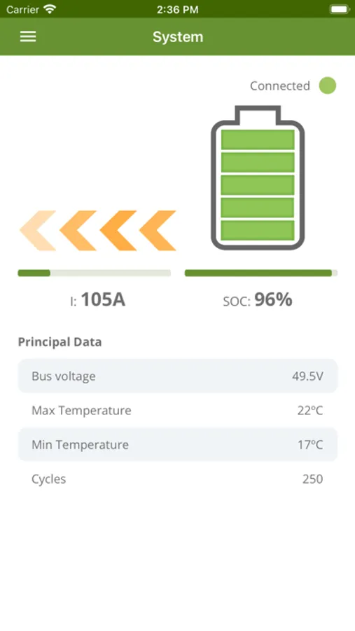 • Parameters of the complete system: system voltage, current, state of charge, temperature and cycles performed