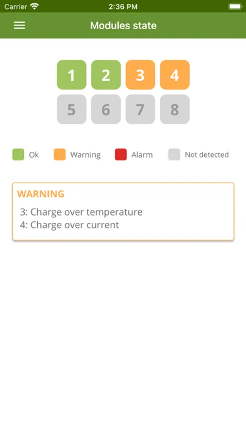 • Status of the modules: you will be able to know the status of each module, alarms, warnings, etc.