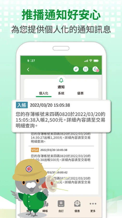 一、 推播通知:推播通知好安心,為你提供個人化且即時的通知訊息。