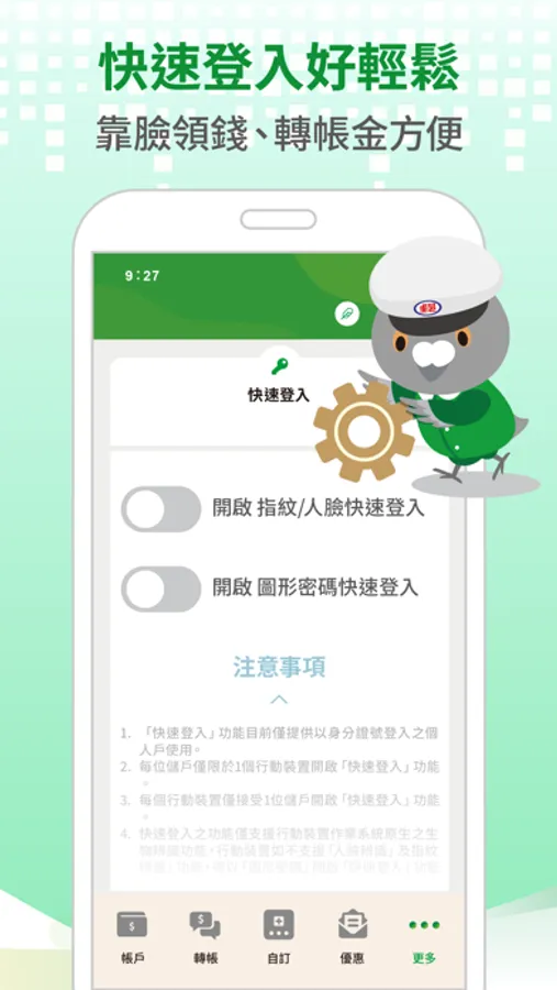 四、 快速登入:一次設定好輕鬆,用生物辨識或圖形密碼,交易更方便。