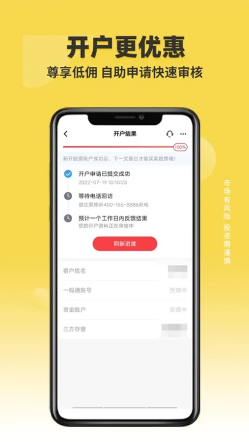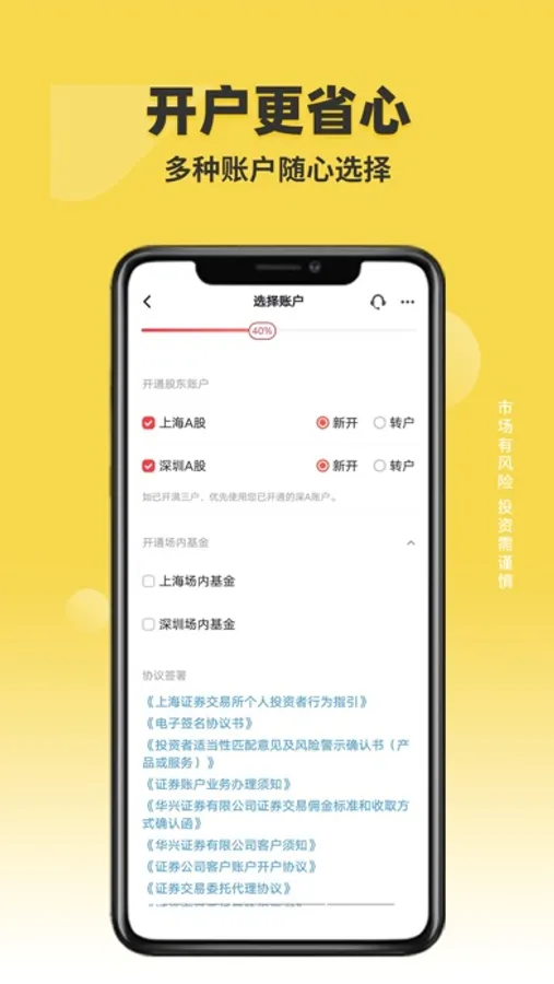 3、开户更省心:沪深A股账户、基金账户,一次操作全部开通,免去重复操作,省时又省心。