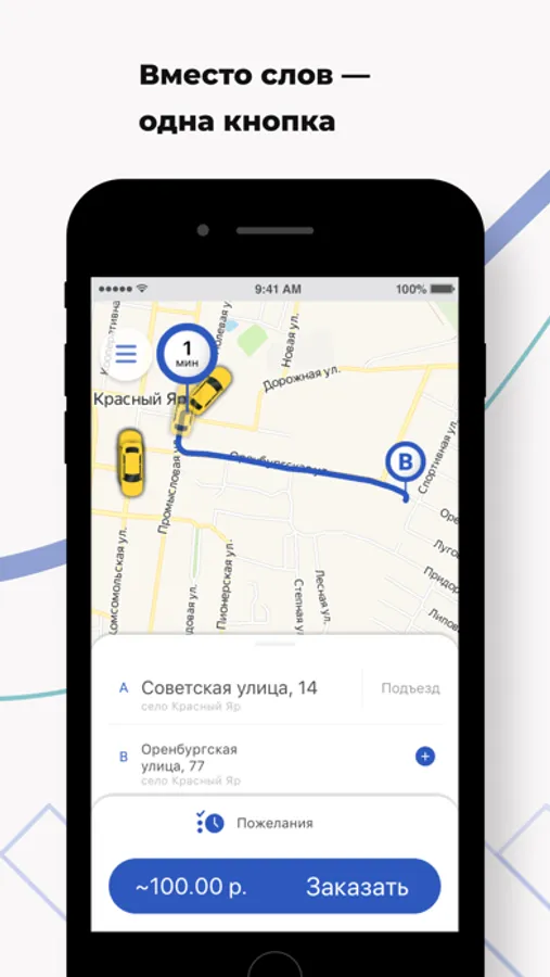 Откройте приложение, укажите адрес и закажите такси, нажав на одну кнопку.