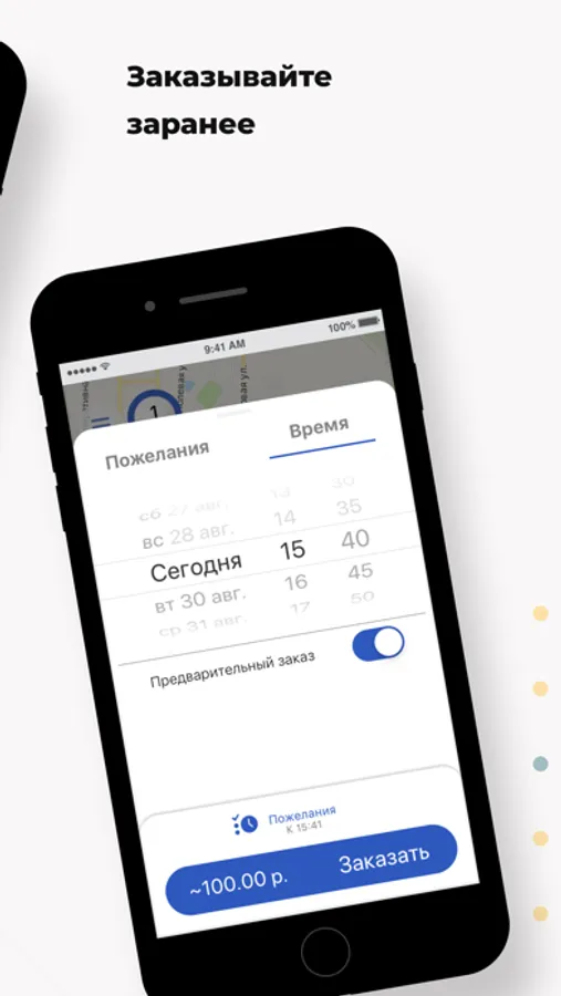 Нужен автомобиль к определенным времени и дате? Закажите его заранее через приложение, и в назначенное время такси будет ждать вас у подъезда.