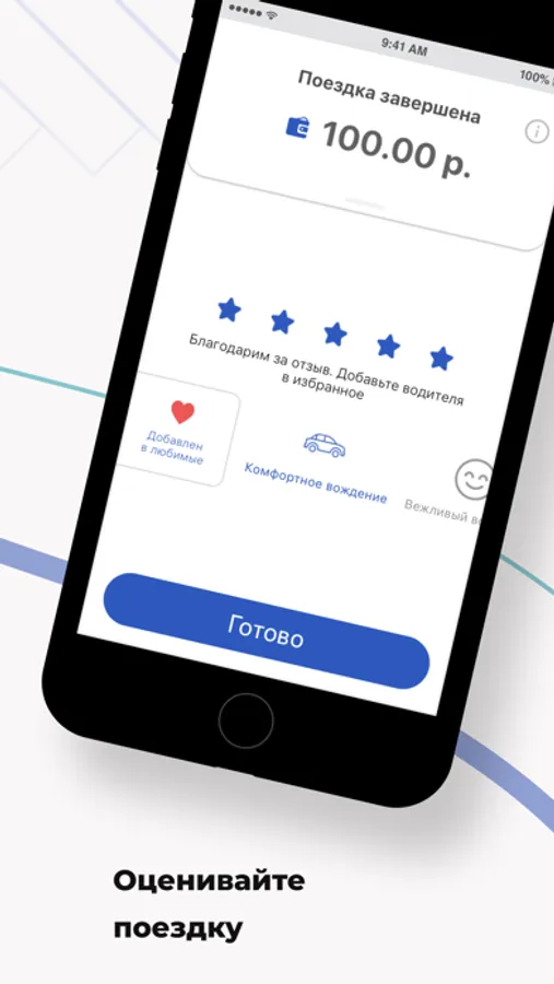 Оценивайте поездку с помощью готовых шаблонов. Занесите водителя в “Избранные”, если понравилась поездка, или посмотрите детализацию платежей.