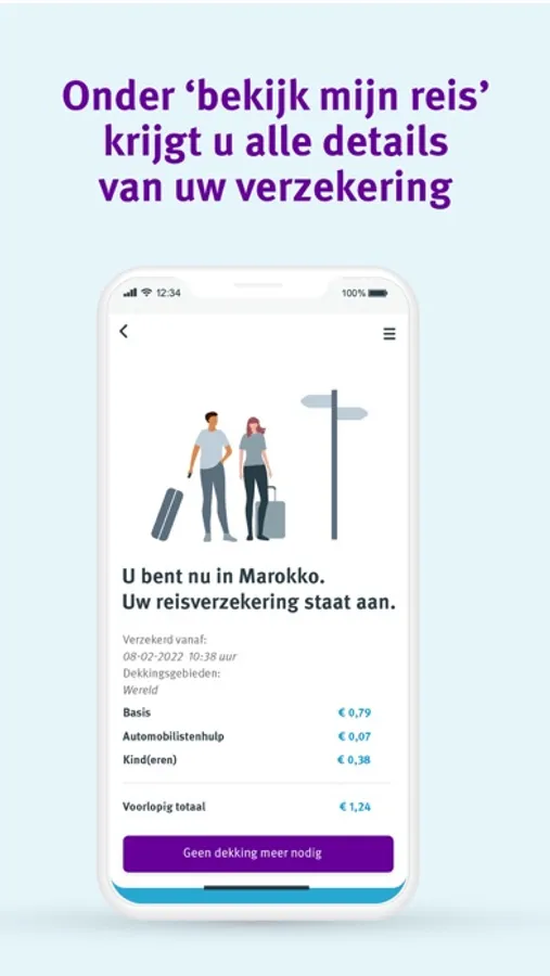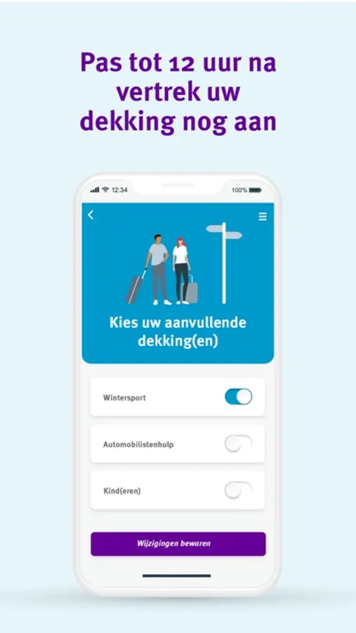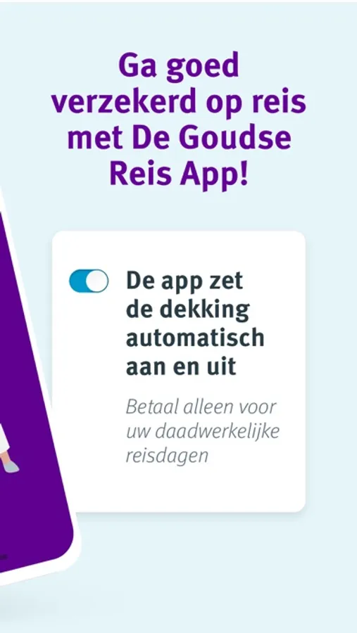 Het enige wat u hoeft te doen is De Goudse Reis App installeren op uw telefoon, uw gegevens invoeren en de app aanzetten. Vanaf dat moment bent u tijdens al uw reizen verzekerd, zonder dat u ergens omkijken naar heeft. Alleen extra dekkingen zet u zelf aan, dat kunt u doen voor wintersport, automobilistenhulp en het verzekeren van meereizende kinderen tot 18 jaar. Uw partner, kinderen ouder dan 18 en andere volwassen reisgenoten verzekert u niet mee, zij kunnen zelf De Goudse Reis App afsluiten.