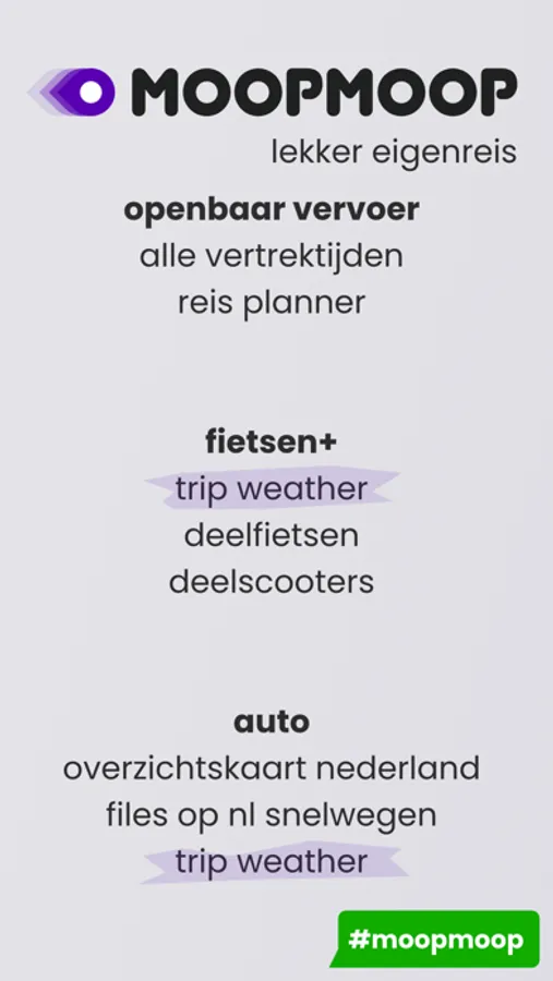 Of je nu vaak op pad gaat, af en toe, jong of oud, verzin het maar, moopmoop (van de makers van Buienalarm, Weerplaza en Weeronline) helpt jou.