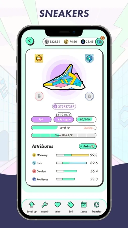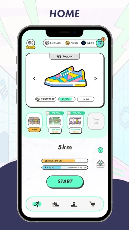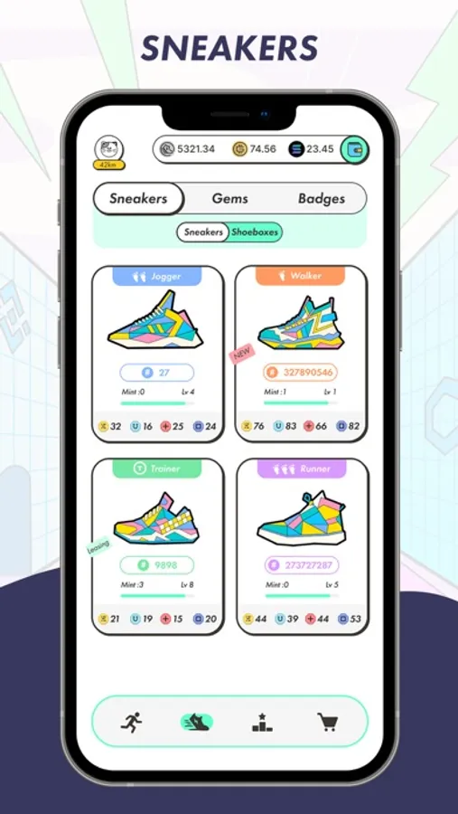 Users equip themselves with NFTs in the form of sneakers. By walking, jogging or running outdoors, users will collect GSTs and NFTs.