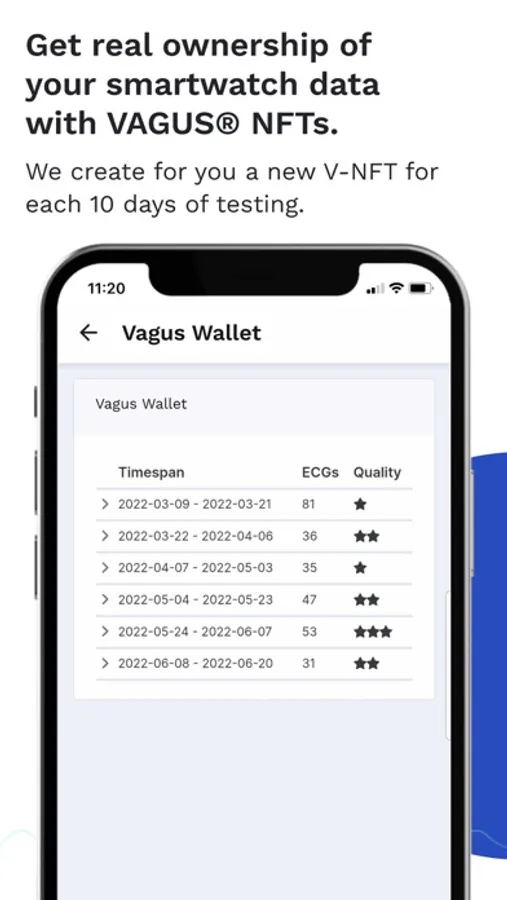 VAGUS® non fungible tokens (V-NFT) are standardized ring-fenced and anonymized data packages, each consisting of 10 unique days of VAGUS® tests, your Q&A text, other data from your smartwatch, and data generated by VAGUS® analytics. We will automatically register a non-blockchained V-NFT when you have done at least 10 days of testing. You find your ownership- and reward tokens in the VAGUS® Wallet.