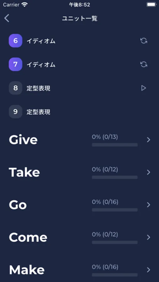 ・イディオムに特化した学習モードで、苦手なイディオムを習得するまで何度でも学習。