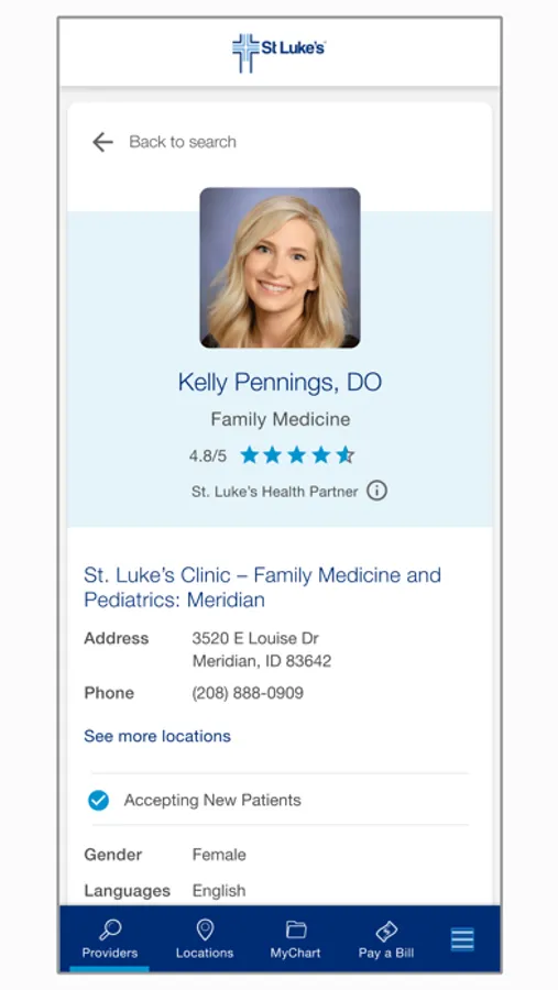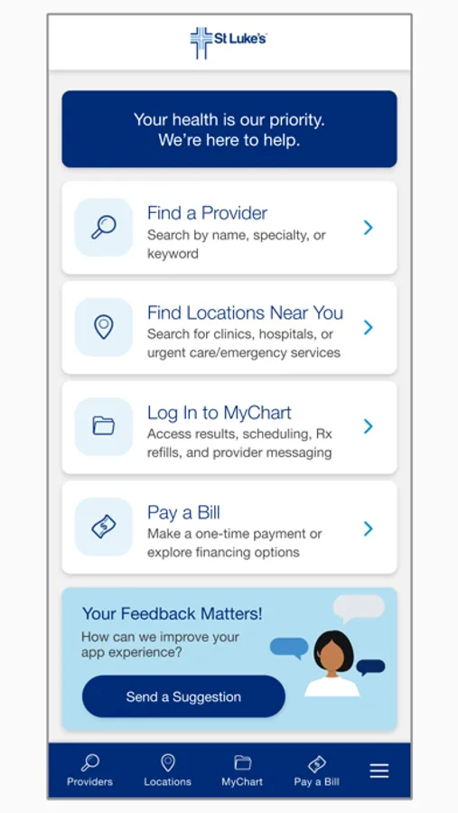 Connect with St. Luke’s to access high quality primary and specialty health care. Whether you’re looking to establish long-term care with a provider or need more immediate support, we can help you find care that meets your needs. This app also links to your MyChart account, making it easy for you to view test results, contact your provider, request medication refills, schedule appointments, and more. You can even link to St. Luke’s Bill Pay to make a one-time payment or explore financing options.