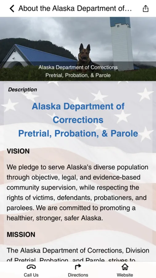 On behalf of the men and women of the Alaska Department of Corrections, Division of Pretrial, Probation, and Parole, welcome to our app. This app is for the employees and family members of the Alaska Department of Corrections, Division of Pretrial, Probation, and Parole as well as the community it serves. It contains information about our department as well as safety and crime prevention tips. Alaska Department of Corrections, Division of Pretrial, Probation, and Parole employees will have access to a full range of wellness tools.