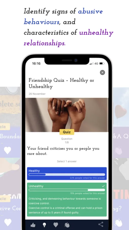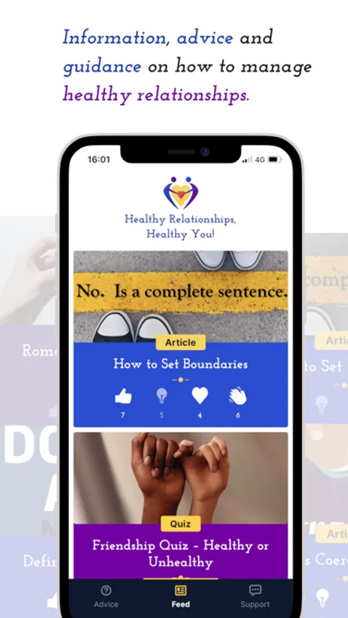 The Healthy Relationships app shares information in the form of interactive quizzes and case studies to engage more with the user.