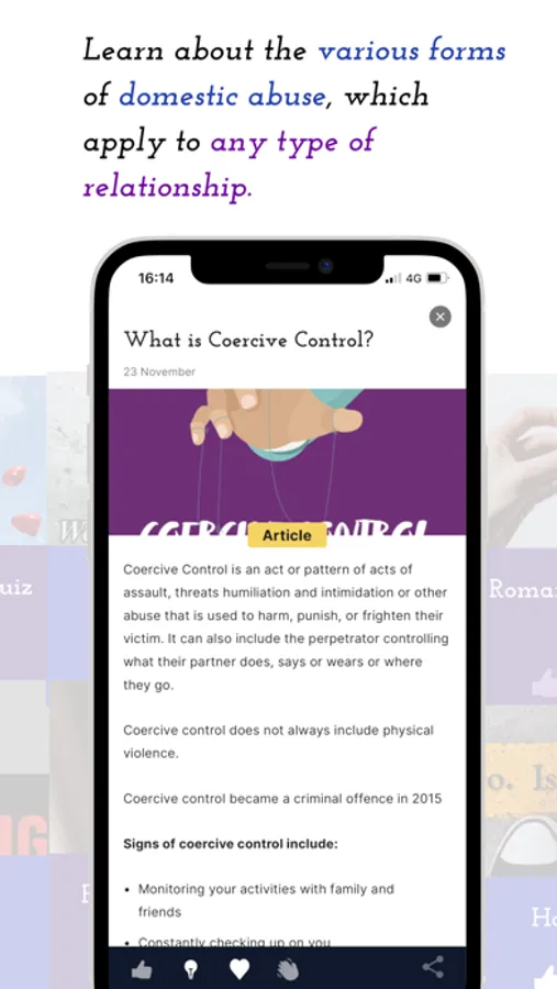 It educates on how to spot signs of abusive behaviours and characteristics of unhealthy relationships, in any type of relationship, and explains the various forms of domestic abuse.