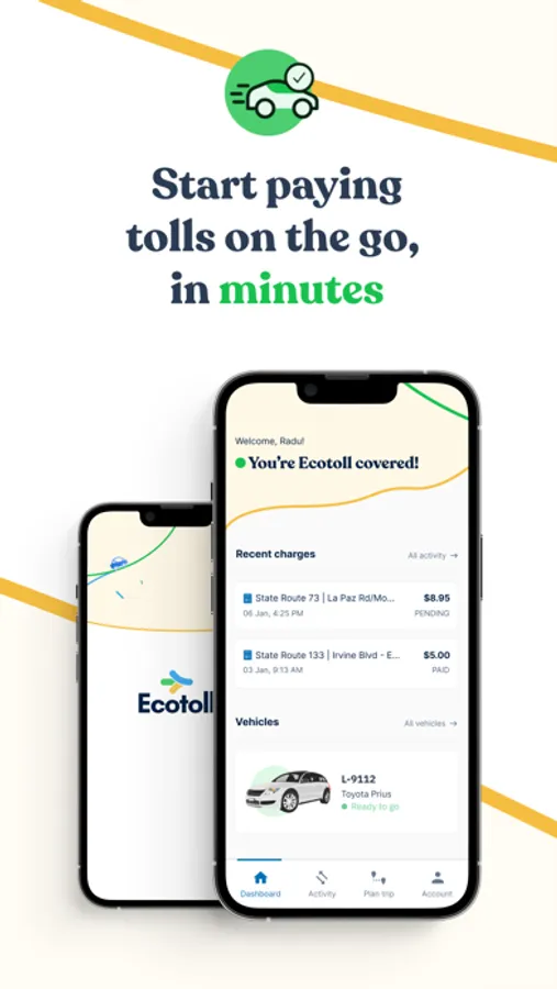 For a small convenience fee, Ecotoll lets you pay for toll roads, toll bridges, and express lanes no matter what car you’re driving. No minimum balance and no top-up required.