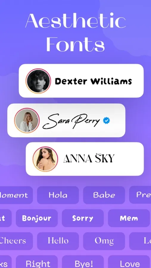 Make awesome Instagram & Snapchat profiles with Fonts! Get more likes for your Twitter posts & tweets. Surprise your friends on WhatsApp, Telegram & iMessage. Create eye-catching bios, captions, and other elements for your Instagram profile. Highlight your profile among others in Tinder, Badoo, Bumble.