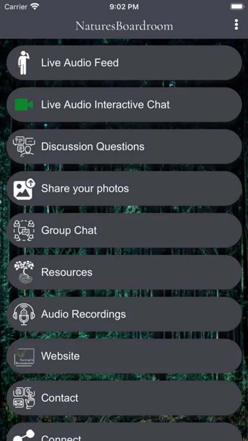 This app allows you to connect with your group in person or virtually while walking on forest trails. The audio live stream allows the Nature's Boardroom facilitator and your team leaders to speak to the group without amplified sound and instead everyone uses headphones to hear the live stream. The app also includes discussion questions with a place to record your answers, group chat, video chat for remote participants and additional resources.
