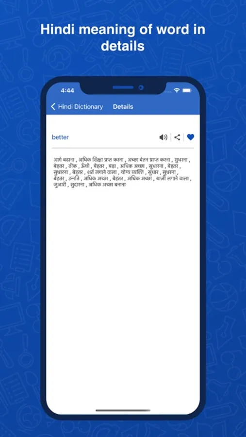 7- You can create a favourite list in our app of the translated words and can share it with anyone in their English and Hindi meaning.