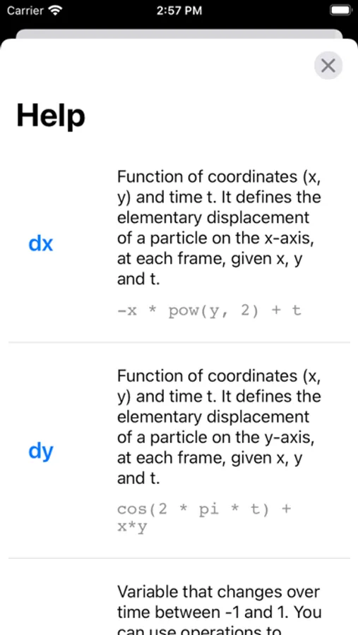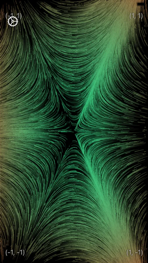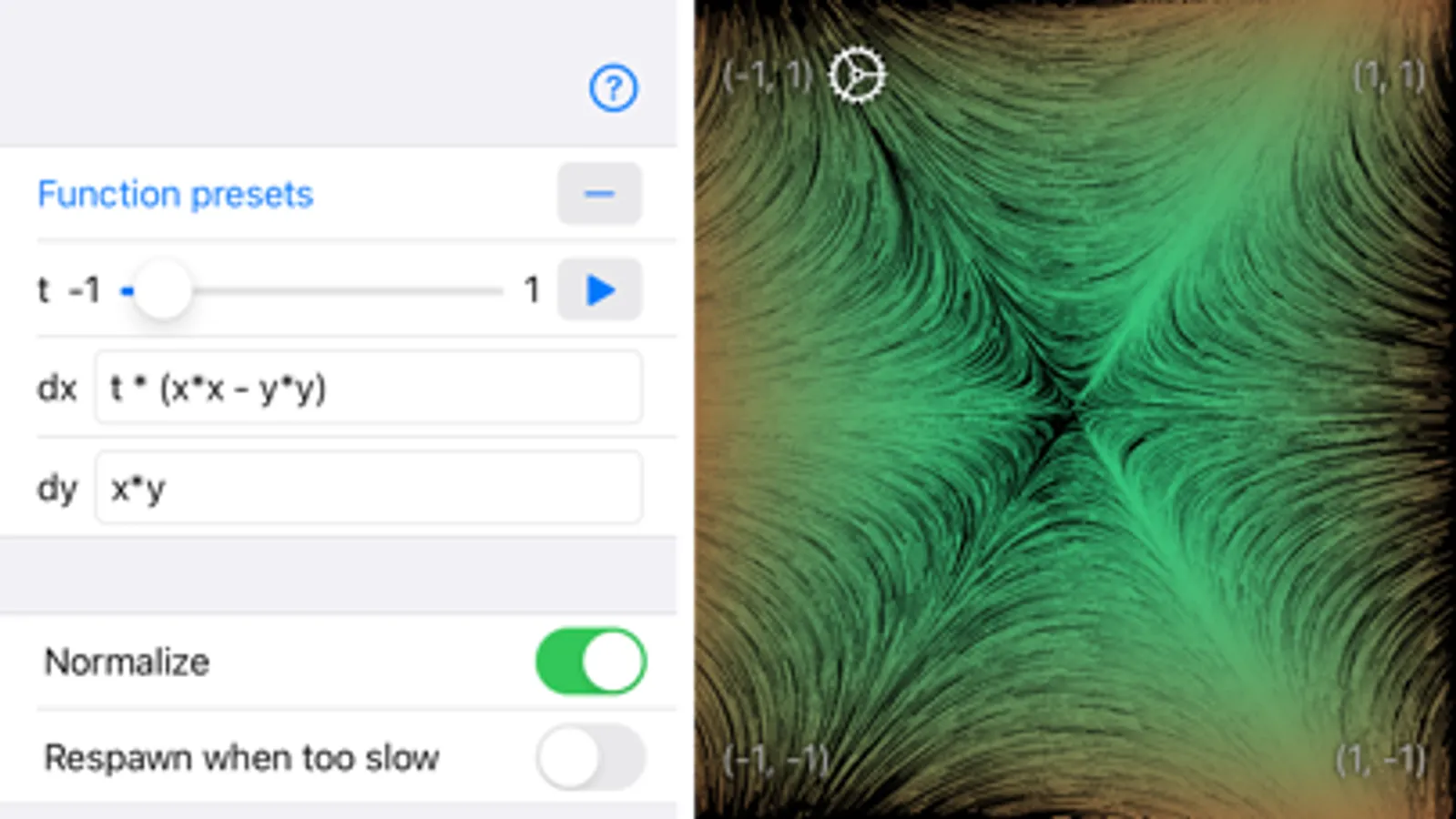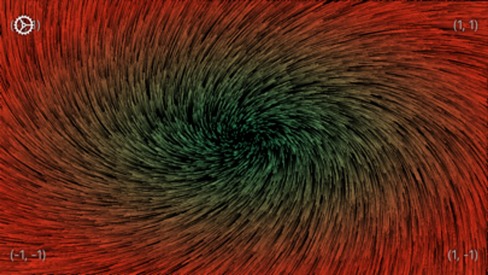 Enter the equation of the field and let the app simulate thousands of particles moving along the vector field.