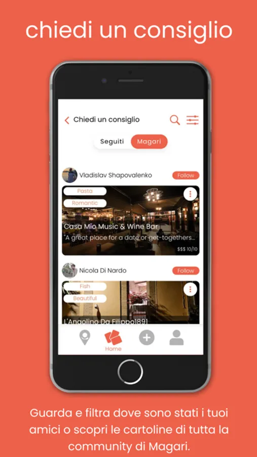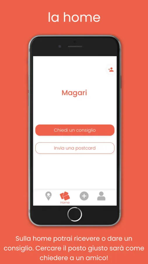 Sulla “home” potrai chiedere o dare un consiglio, la sensazione è proprio quella di parlare con un amico. Nella sezione “chiedi un consiglio” puoi vedere e filtrare tutte le cartoline dei tuoi amici o di tutta la community. Nella sezione “dai un consiglio” potrai inviare le tue cartoline ai tuoi amici.