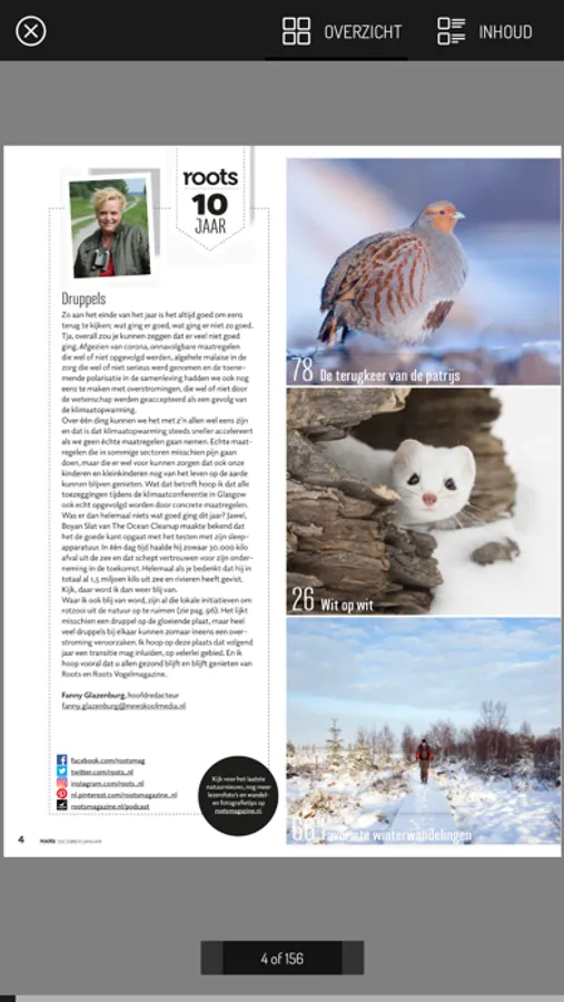 Sowieso elke maand een unieke Roots-wandeling met routekaart en gps-track * de columns van journalist en vogelaar Saskia van Loenen en bioloog René Krekels * foto’s van lezers in Foto van de Maand * Wat een vraag! Met antwoorden van experts op de meest intrigerende natuurvragen * sterren kijken met Govert Schilling.