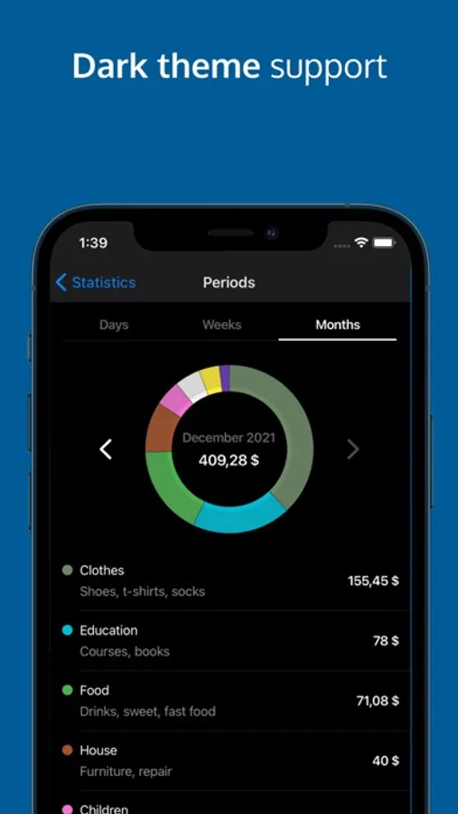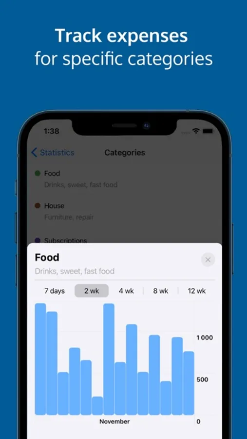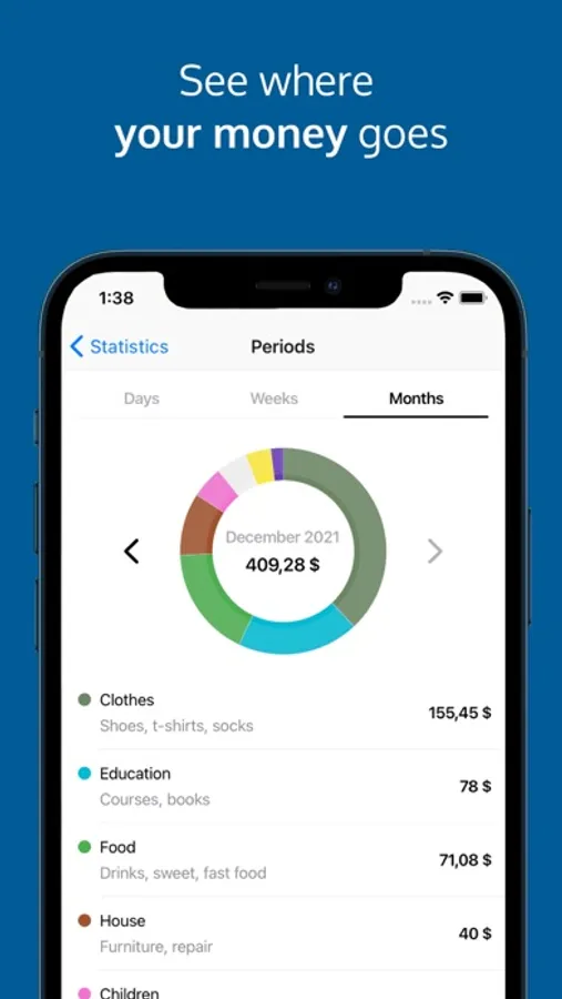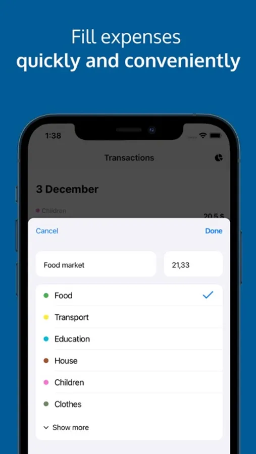 The app will allow you to write your daily expenses quickly and easily. A well-thought-out interface will help with it. The most frequently used categories are shown, and tips with the most frequent names are given when filling out.