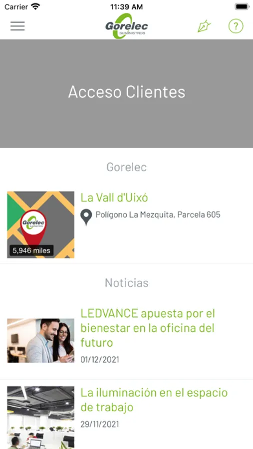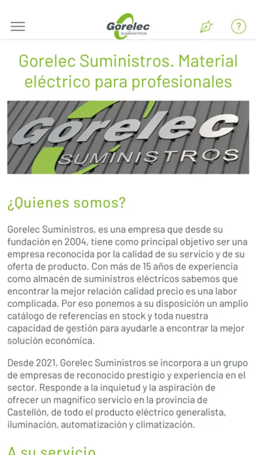 Aplicación con información corporativa de Gorelec Suministros, información sobre eventos organizados, puntos de venta del grupo y de acceso restringido para los clientes a su zona privada desde la cual pueden tener acceso a sus documentos (albaranes, facturas, pedidos), estado de sus pedidos, consulta de precios y disponibilidad de productos.