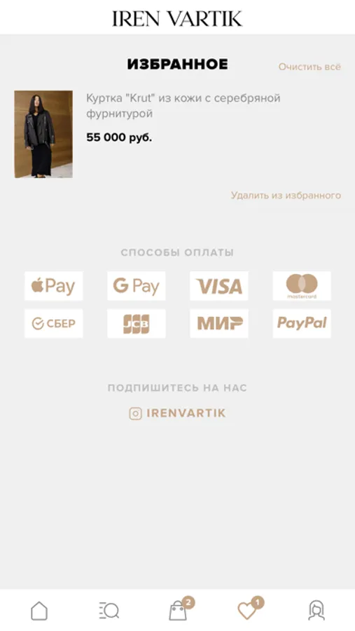 Мы дарим скидку до 25% всем участникам программы лояльности IREN VARTIK EXCLUSIVELY. Скидка действует как при покупке в бутиках, так и в онлайн-магазине.